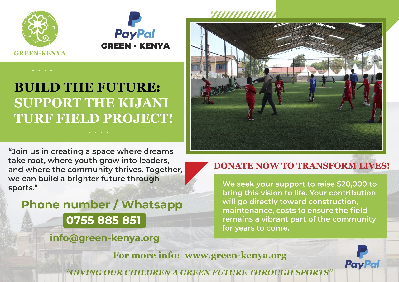 The Kijani Turf Field Project: Transforming Lives Through Sports. At the heart of Green-Kenya’s mission to give children a green future through sports lies the Kijani Turf Field Project. This 7-a-side artificial turf field will be a beacon of hope, growth, and opportunity in the community. Designed to provide a safe, accessible, and high-quality space for youth and adults to engage in sports and self-directed learning, this project epitomizes our vision of fostering unity and catalyzing positive change through sports.